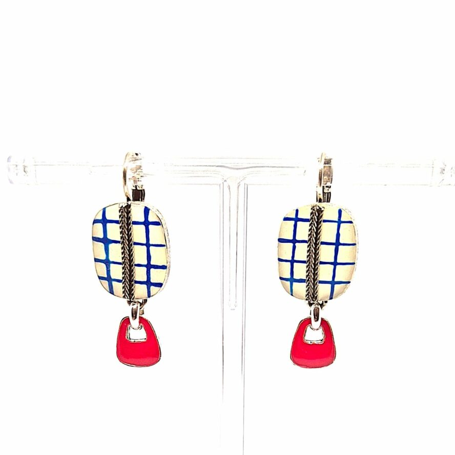 Dormeuses en bronze argenté. Les différents éléments sont peints à la main et sont dans la thématique de la trousse d’école. Légères, mobiles et faciles a assortir.