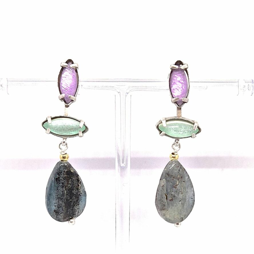 Boucles tiges droites en bronze argenté avec un subtile mélange de pierres naturelles dans les teintes froides. La kyanite est sublimé par la touche d’aigue marine et nacre.