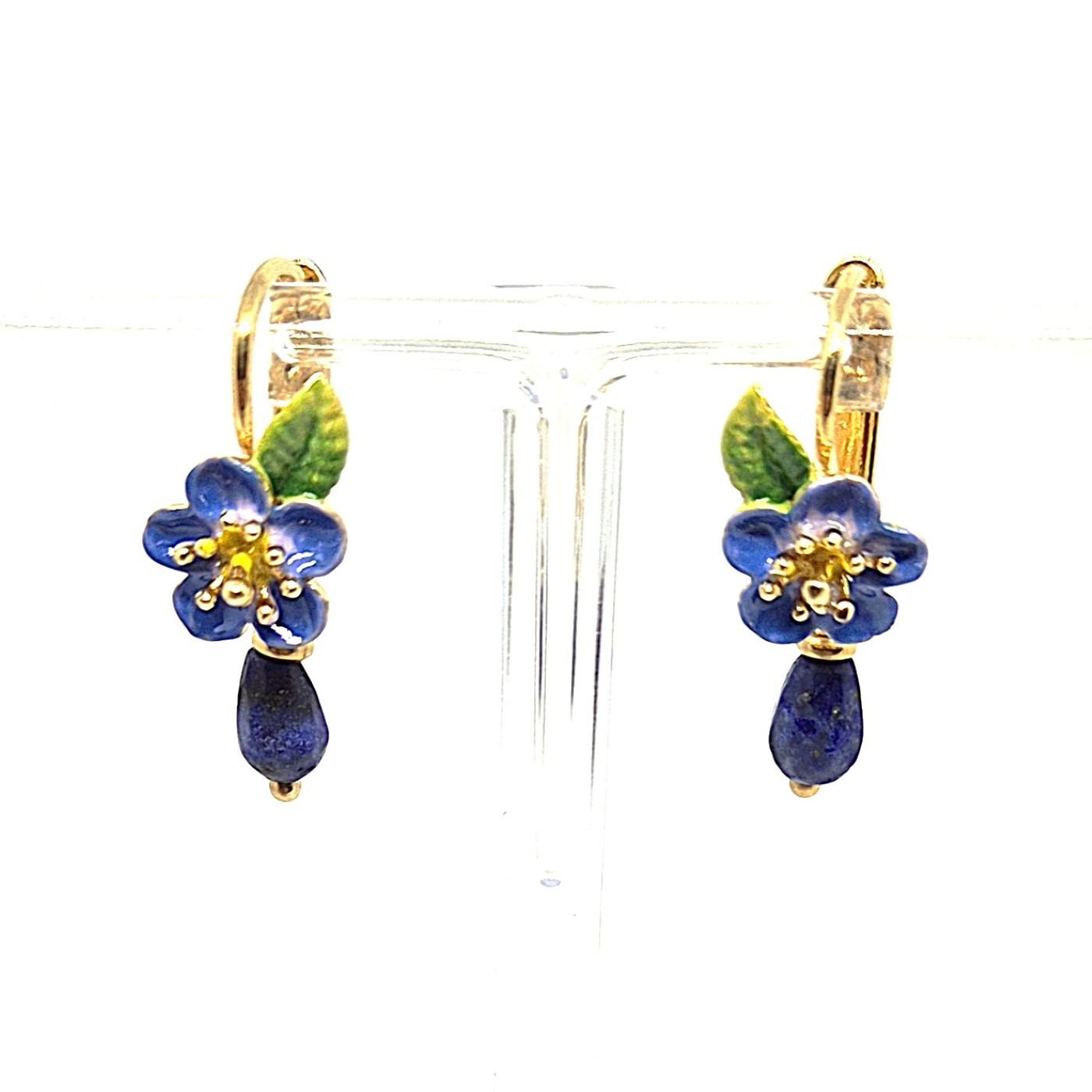 Dormeuses fleur en laiton doré, elle est finement travaillée. Riche en détails qui ressortent avec l’émail. Une goutte de lapis lazuli , donne de la légèreté a l’ensemble.