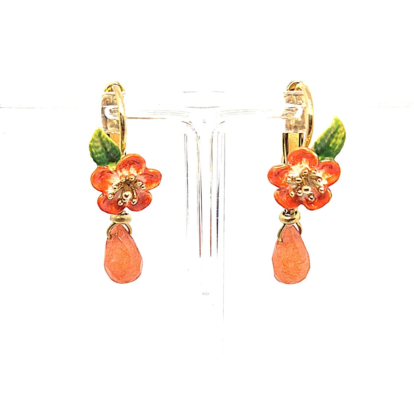 Dormeuses fleur en laiton doré, elle est finement travaillée. Riche en détails qui ressortent avec l’émail. Une goutte d’agate orange, donne de la légèreté a l’ensemble.