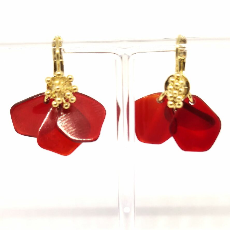 Dormeuses avec 3 pétales en corne teintée , pour former une fleur avec son cœur en bronze doré pour donner de la lumière. C’est un ensemble puissant et délicat à la fois.