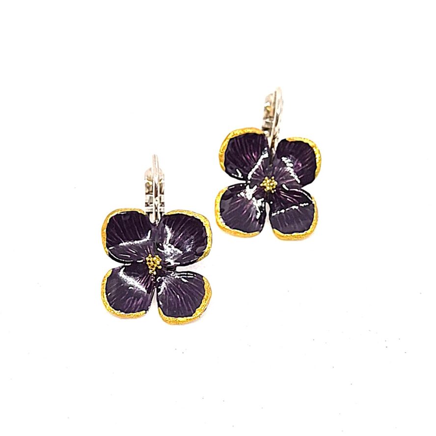 Dormeuses en bronze argenté, les fleurs sont peintes à la main dans les tons de prune , un léger liseré doré apporte de la lumière à l’ensemble.