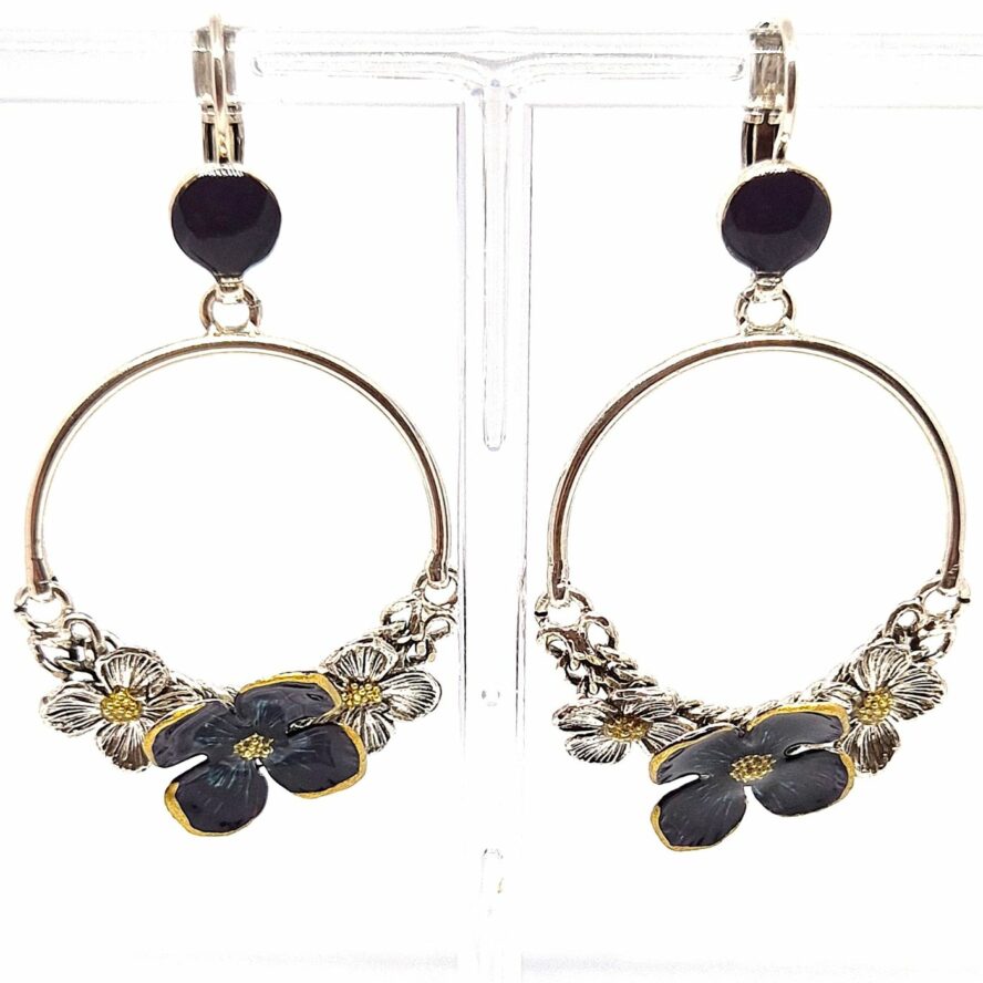 Dormeuses en bronze argenté, des fleurs peintes à la main dans les tons de prune et bleu sont disposées sur le bas de l’anneau. Un léger liseré doré apporte de la lumière à l’ensemble.