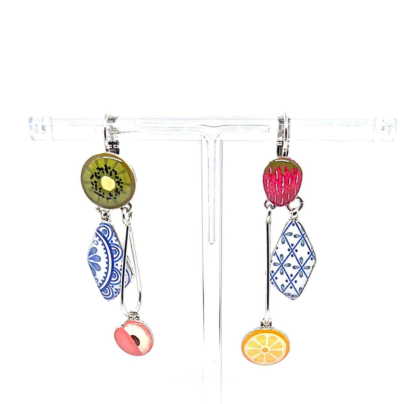 Dormeuses dépareillées en bronze argenté. Une multitude de fruits y sont représentés, donnant l’image d’une belle salade de fruits. Tous les éléments sont peints à la main. Boucles légères et colorées.