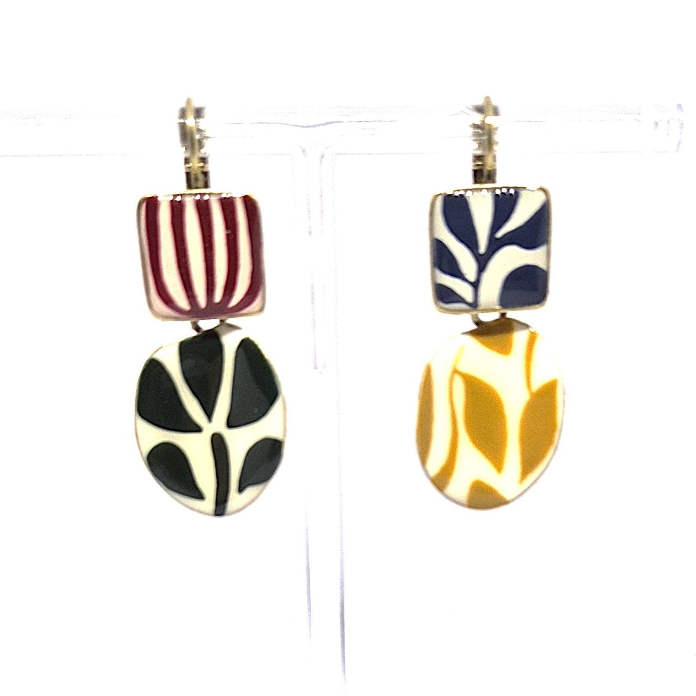 Dormeuses dépareillées en bronze. Les éléments sont de forme, couleurs, et motifs différents. Tous les éléments sont peints à la main. La base de couleur crème fait ressortir le motifs harmonieux. Boucles légères et mobiles.