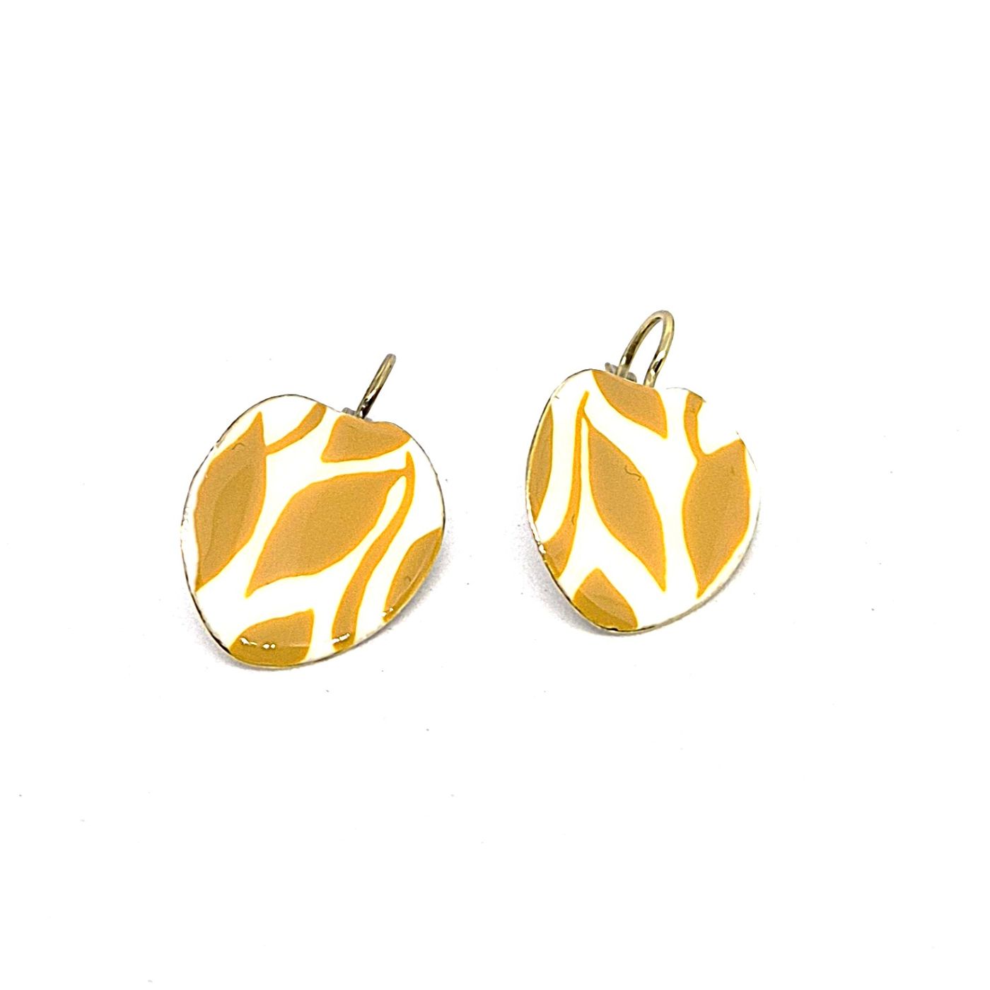 Dormeuses en bronze de forme ovale , légèrement incurvées. Tous les éléments sont peints à la main. La base de couleur crème fait ressortir le motifs harmonieux.