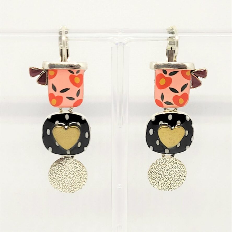 Dormeuses en bronze argenté composé de 3 éléments . Les motifs sont différents et peint à la main, la tasse dans les tons de rose et un motif noir a poids blancs . Des cœurs en hématites doré donnent de la lumière à la boucle. Boucles légères et douces .