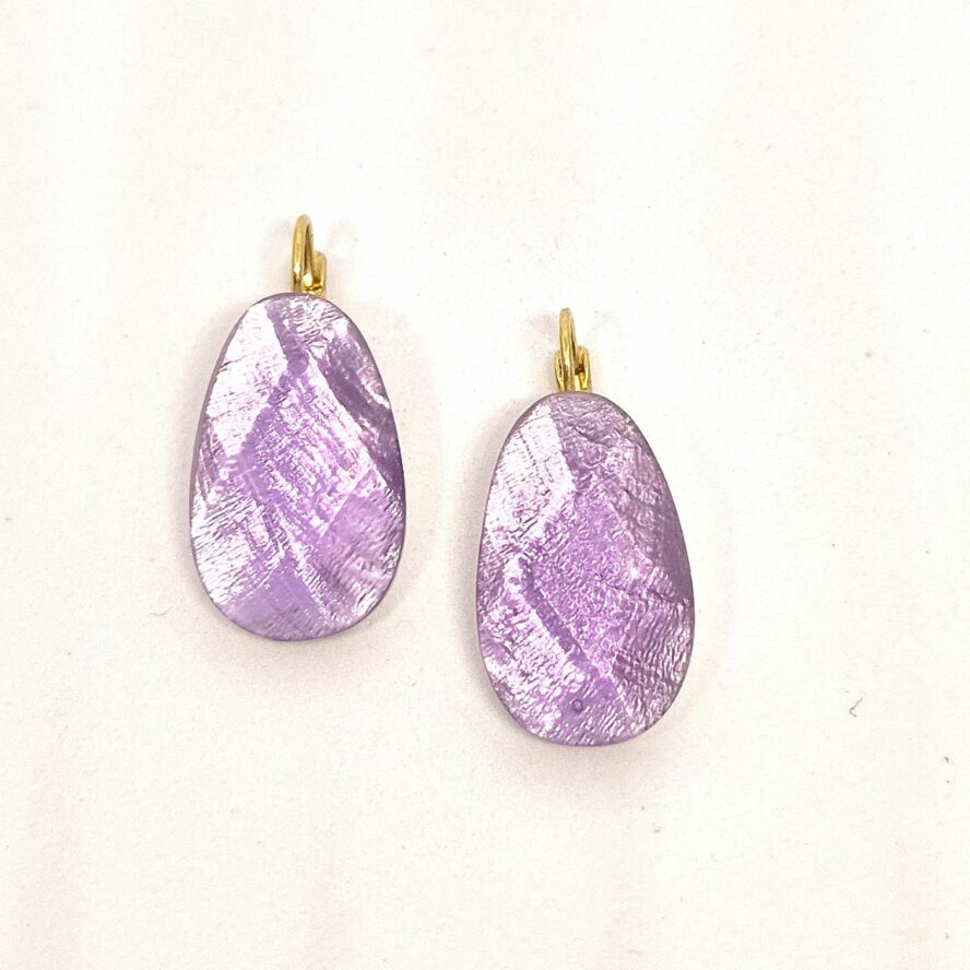 Dormeuses en bronze doré à l’or fin en forme de goutte, mettant en valeur de nacre prise sous une résine teintée . Ensemble sobre te raffiné