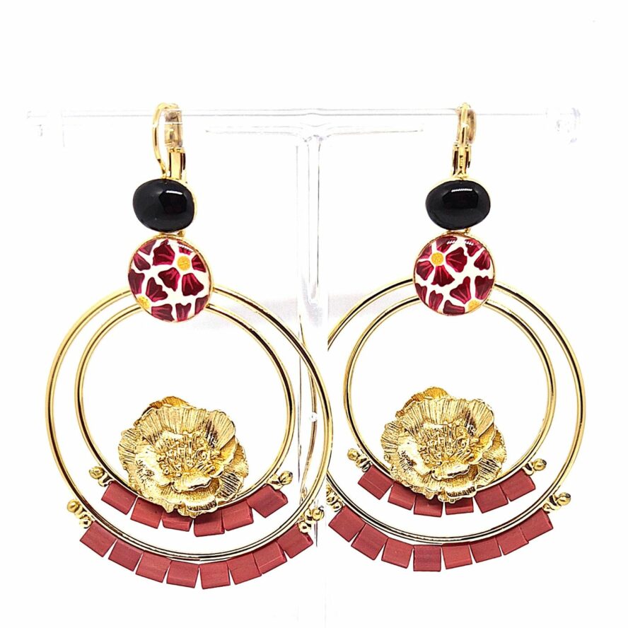 Grandes Dormeuses en bronze doré à l’or fin. Boucles graphiques avec la présence de 2 cercles, un élément représentant un magnolia doré se situe au centre du plus petit. Le tout accompagné de perles de miyuki.