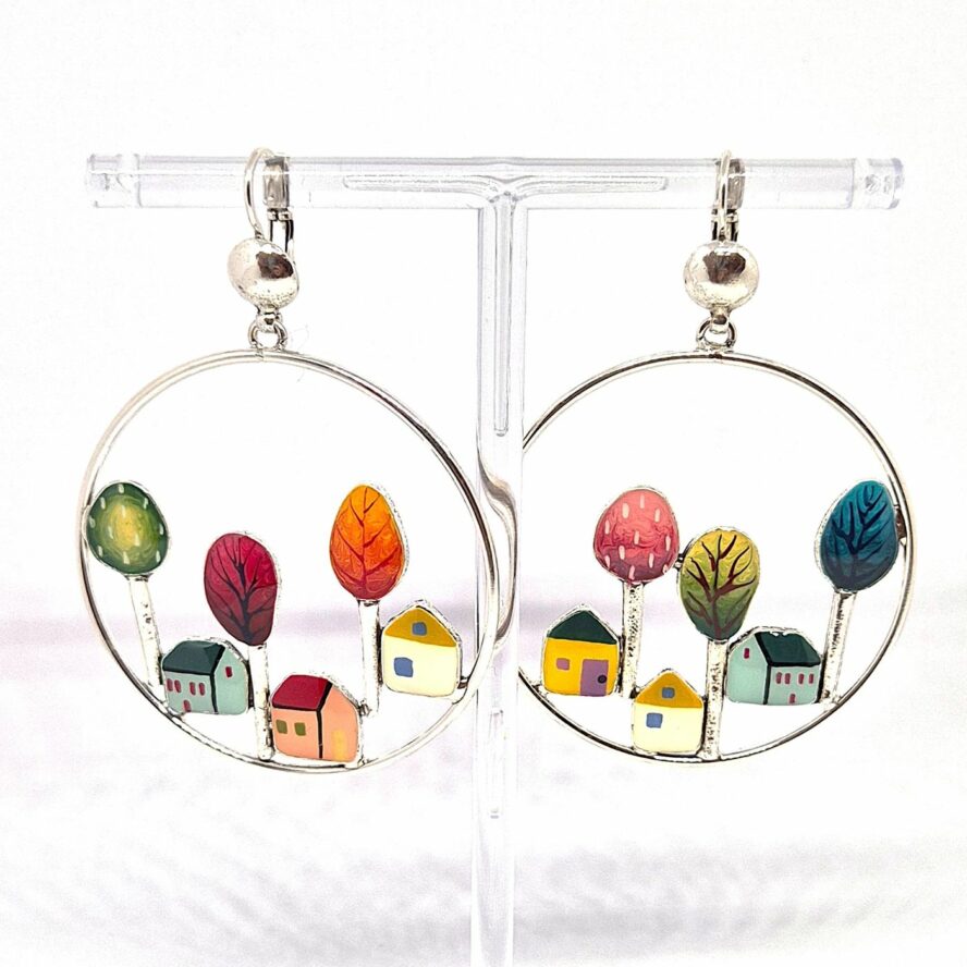 Dormeuses en bronze argenté, en forme de cercle. Les éléments représentent plusieurs maisons de village, tous les éléments sont peints à la main .