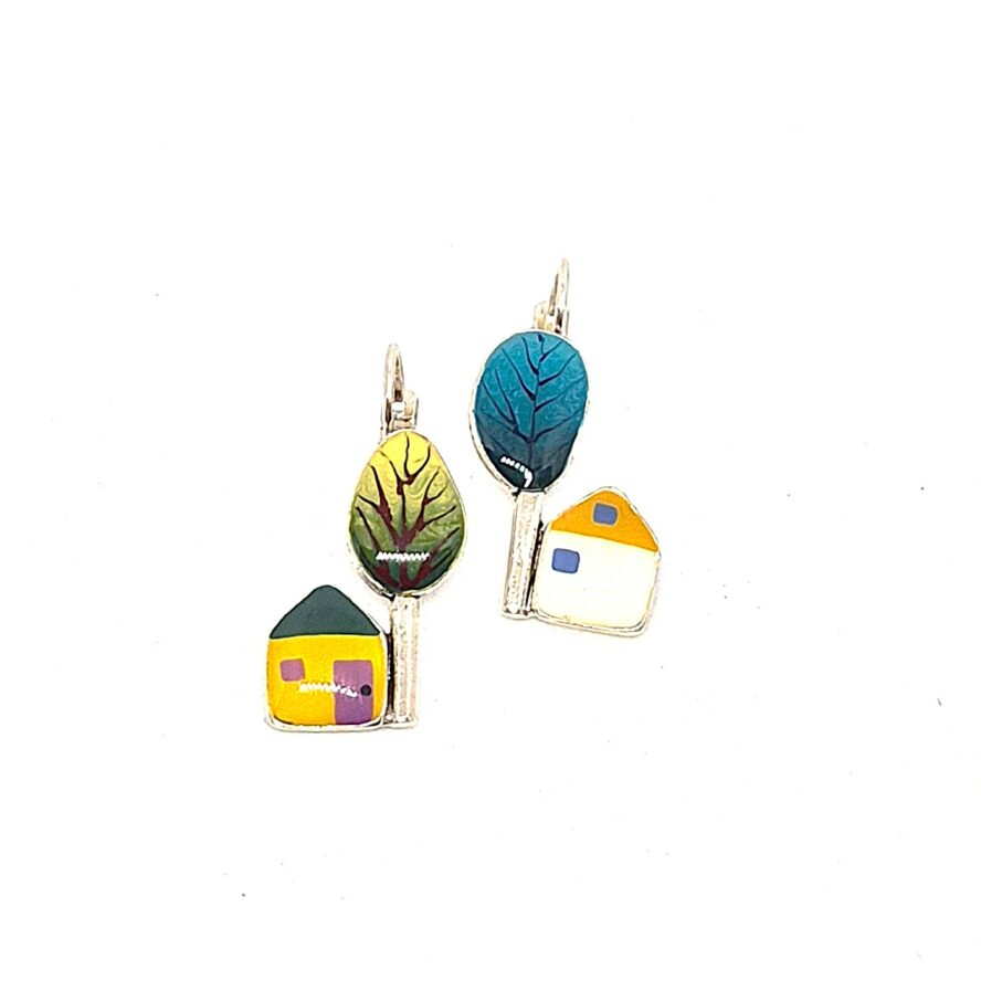 Petites dormeuses dépareillées en bronze argenté. Les éléments représentent plusieurs maisons de village, tous les éléments sont peints à la main .