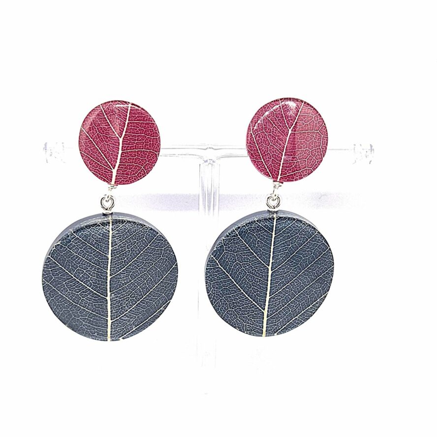 Boucles d’oreilles avec un bouton prune sur le lobe ( 2 cm) , suivie d’un cercle. Chaque éléments sont composés d’une feuille de prise sous une résine colorée. Boucles très légères.