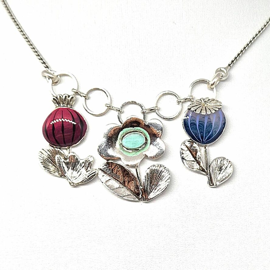 Collier en bronze argenté. Les éléments représentent des fleures de pavot, et sont peintes à la main. Collier léger.