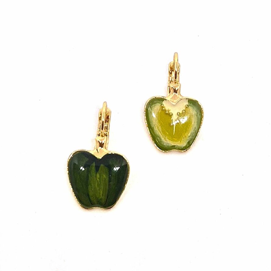 Dormeuses en bronze doré à l’or fin. L’élément représente un légume vert, et est peint à la main. Boucles légères.