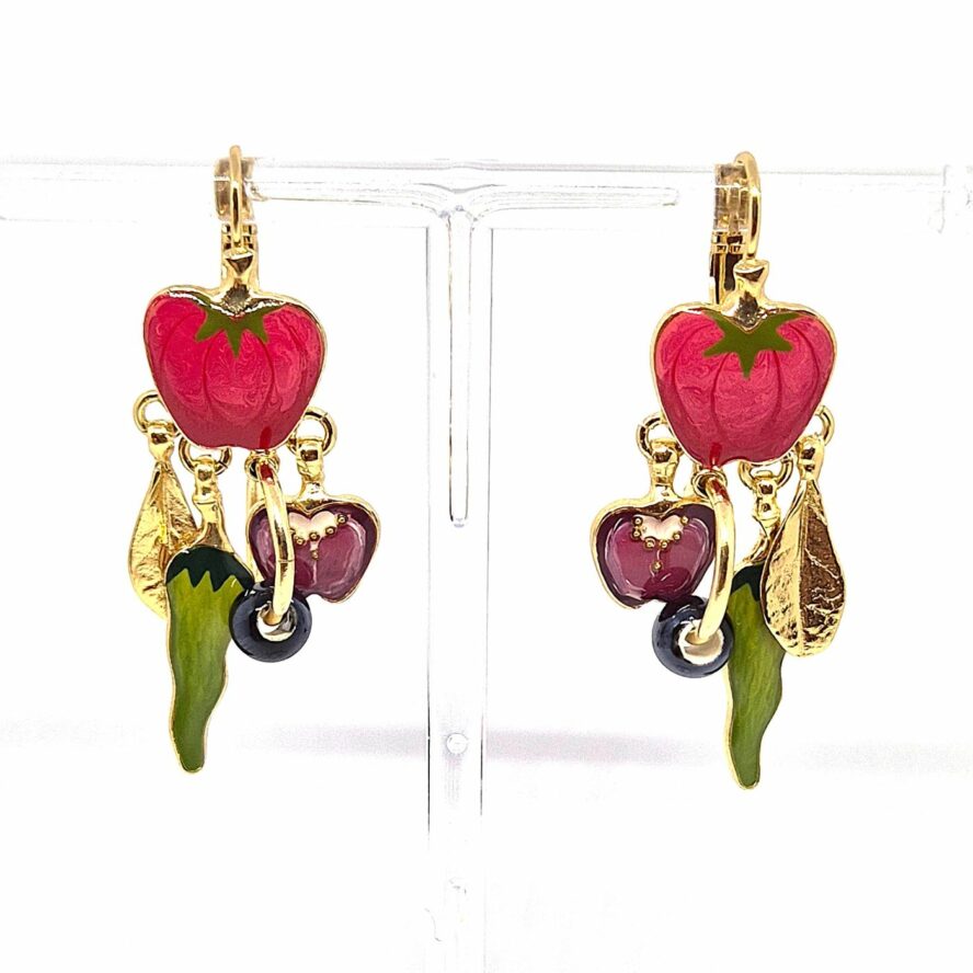 Dormeuses en bronze doré à l’or fin, composée de plusieurs pampilles. Les éléments représentent différents légumes, et sont peints à la main. Boucles légères et mobiles.