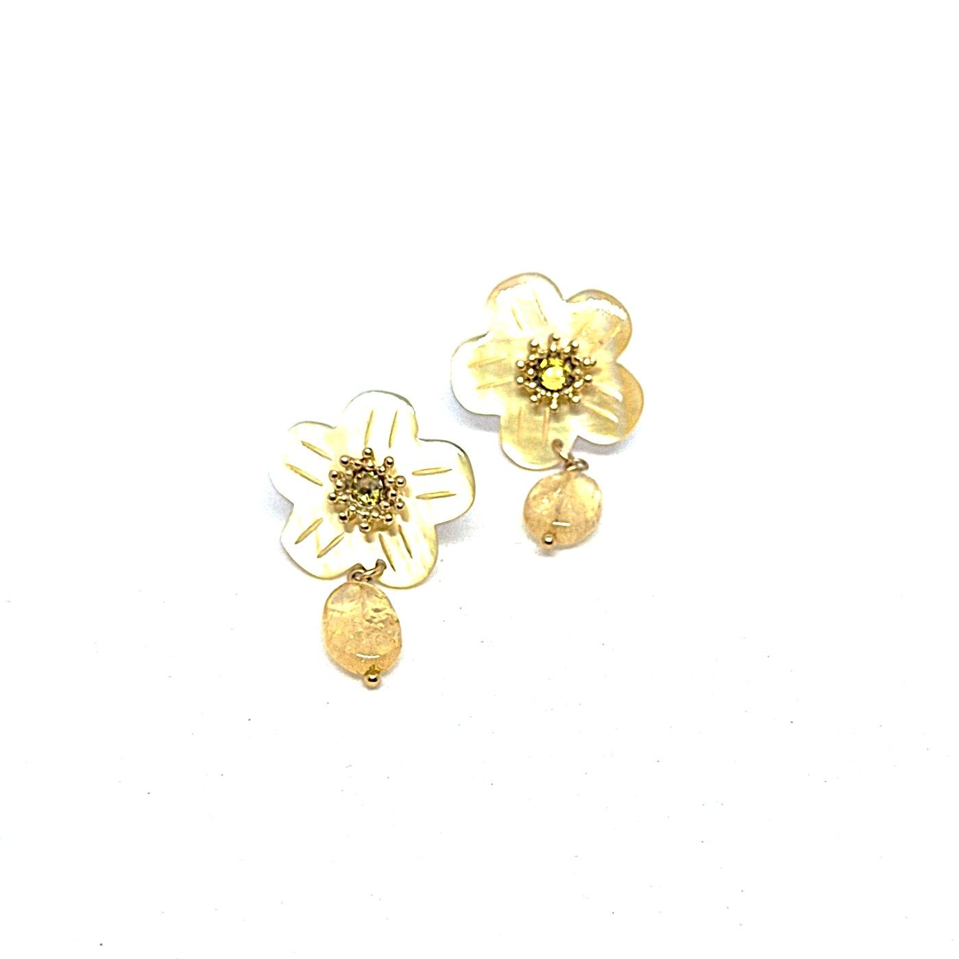 Boucles tiges droites en laiton doré, une fleur de nacre jaune sur le lobe. Le cœur de la fleur est délicatement travaillé en laiton et accentué par le cristal. Boucles lumineuses et aérienne avec sa pampille de citrine.