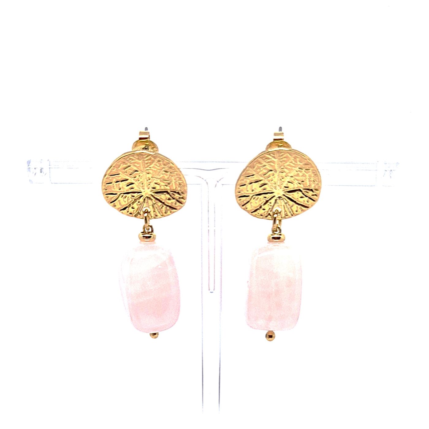 Boucles tiges droites en laiton doré, un disque ( 2 cm ) froissé au niveau du lobe met en lumière le quartz rose.