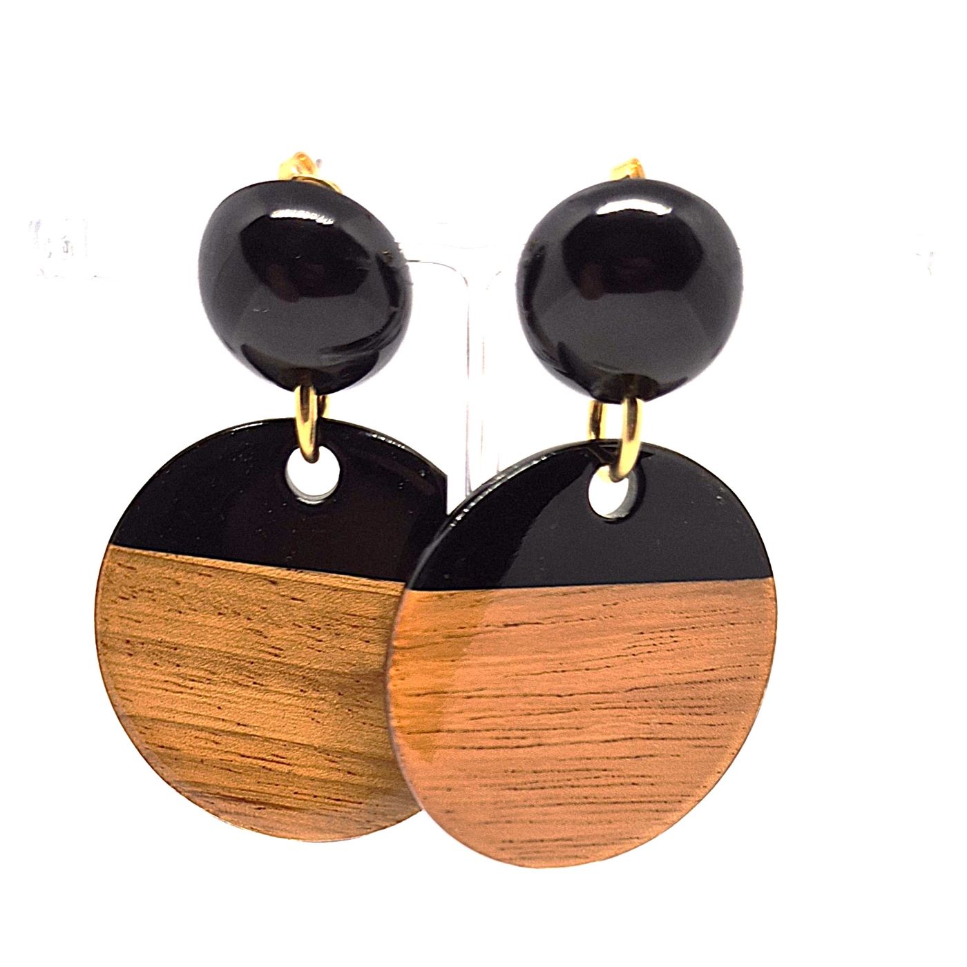 Boucles d’oreilles à tiges droites avec un subtile mélange entre le bois de Bayong de couleur chaude ambrée et le noire de la corne. Boucles légères et très graphiques.