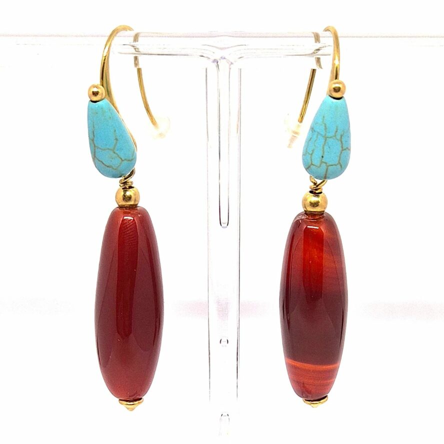 Boucles d’oreilles crochet en bronze doré, avec des couleur franches et tranchées. La petite perle de howlite met en valeur la navette d’agate rouge. Boucles légères et mobiles.