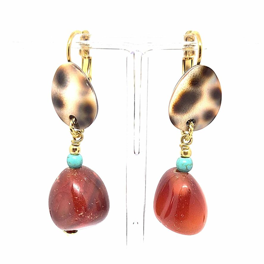Dormeuses en bronze doré, avec des couleur franches et tranchées. La présence de la porcelaine tigre apporte une nouvelle texture, cela met en avant l’agate rouge et la howlite.