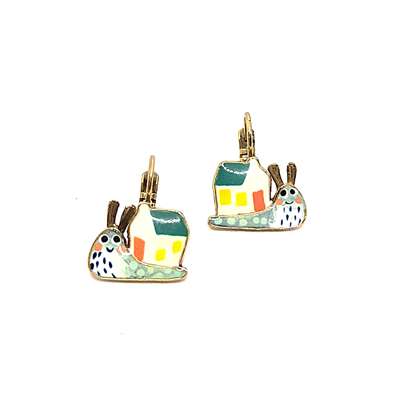 Dormeuse en bronze. Le motif représente un escargot, il est peint à la main dans les couleurs douces .