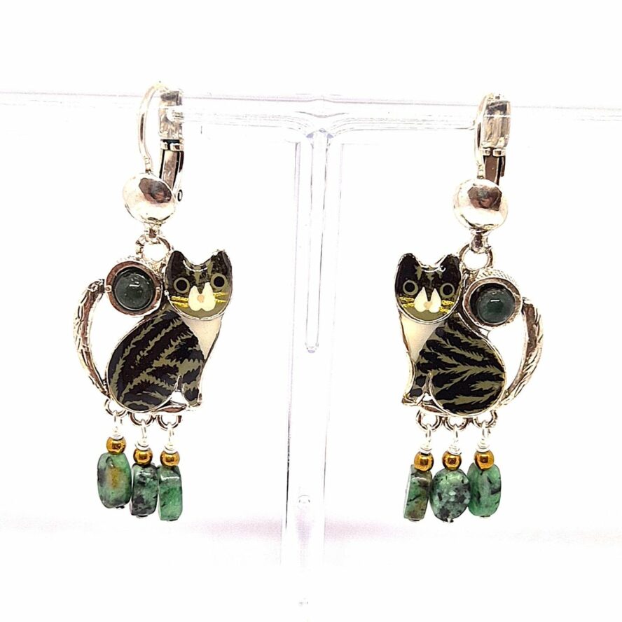 Dormeuses en bronze argenté. Le chat est peint à la main et est agrémenté de pampilles de turquoises. Une petite perle de lapis lazuli en guise de balle.