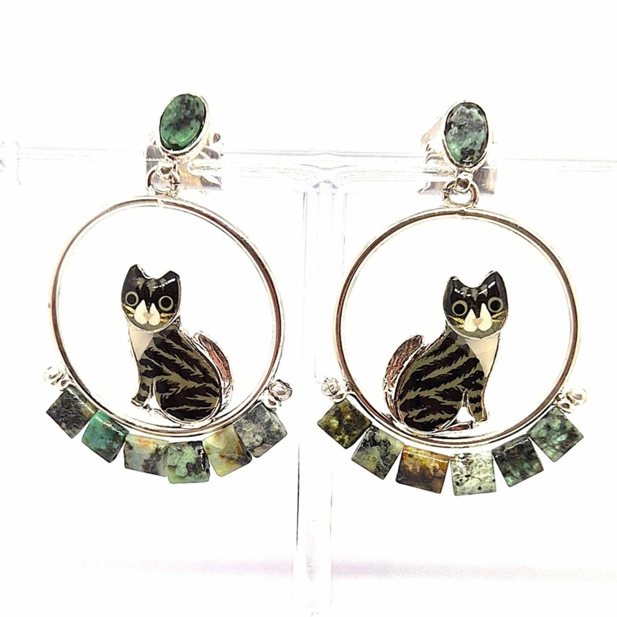 Boucles à tiges droites en bronze argenté. Une perle de turquoise supporte le cercle dans lequel se trouve un chat peint à la main. De petites navettes de turquoises soulignent la boucle et lui donnent du mouvement.