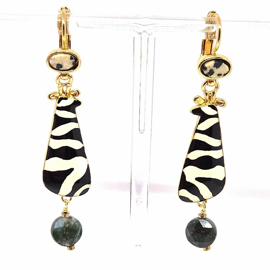 Dormeuses en bronze doré à l’or fin, dans les tons noir et blanc ( peinte à la main ). Elle est mise en valeur est mise en valeur par la présence des différentes pierres, du jaspe dalmatien et et agate mousse en pampille. Boucles légères et mobiles