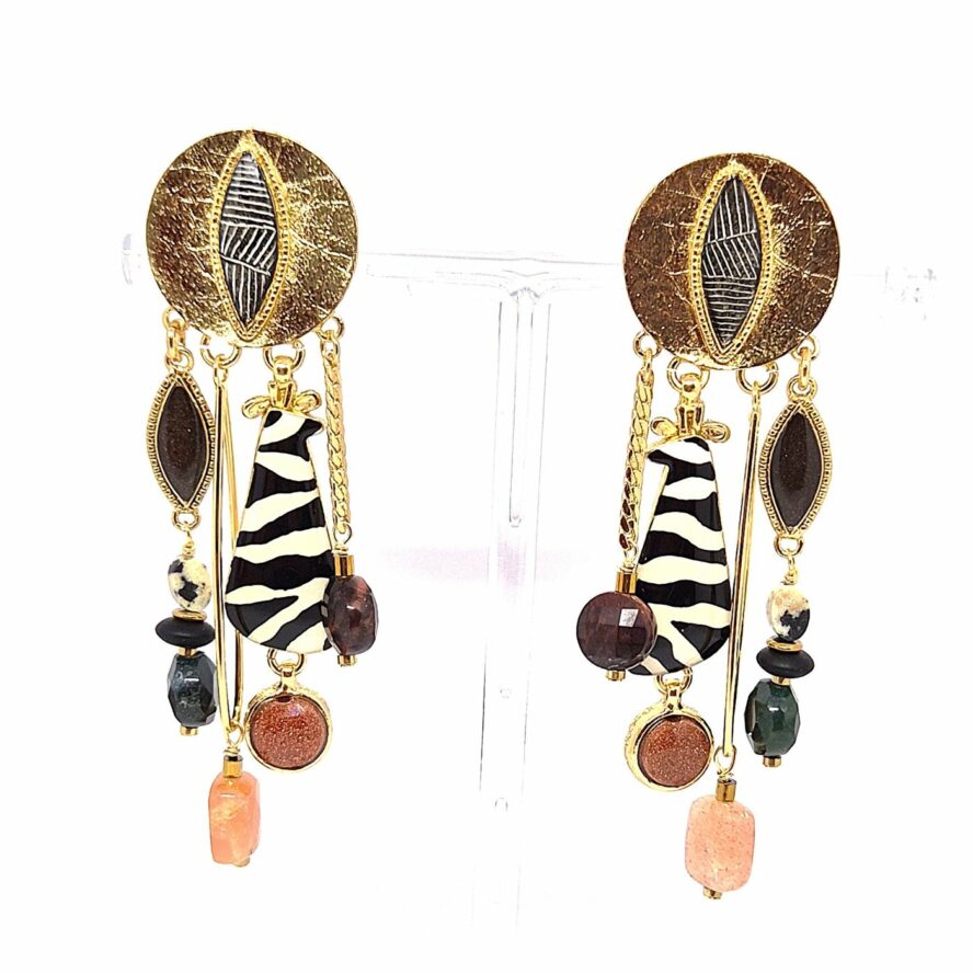 Clip en bronze doré à l’or fin. Une pastille martelée ( 2 cm) avec un élément central en noir et blanc ( peint à la main ). De celui ci part des pampilles de taille et de longueur différente. Un subtile mélange entre les pierres et les parties émaillées