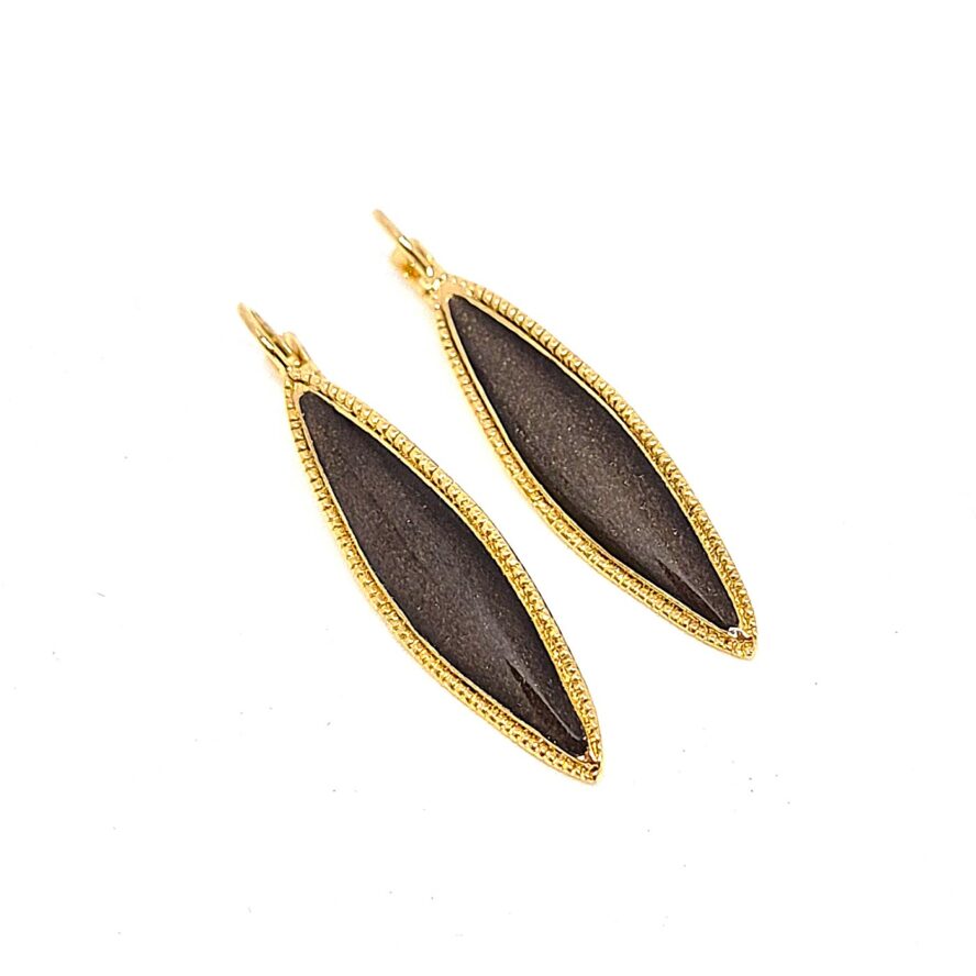 Dormeuses fines et allongées en bronze doré à l’or fin. La partie centrale est composée de poudre de mica , recouvert de résine marron.
