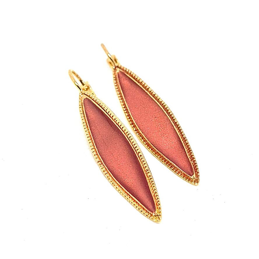 Dormeuses fines et allongées en bronze doré à l’or fin. La partie centrale est composée de poudre de mica , recouvert de résine terracotta