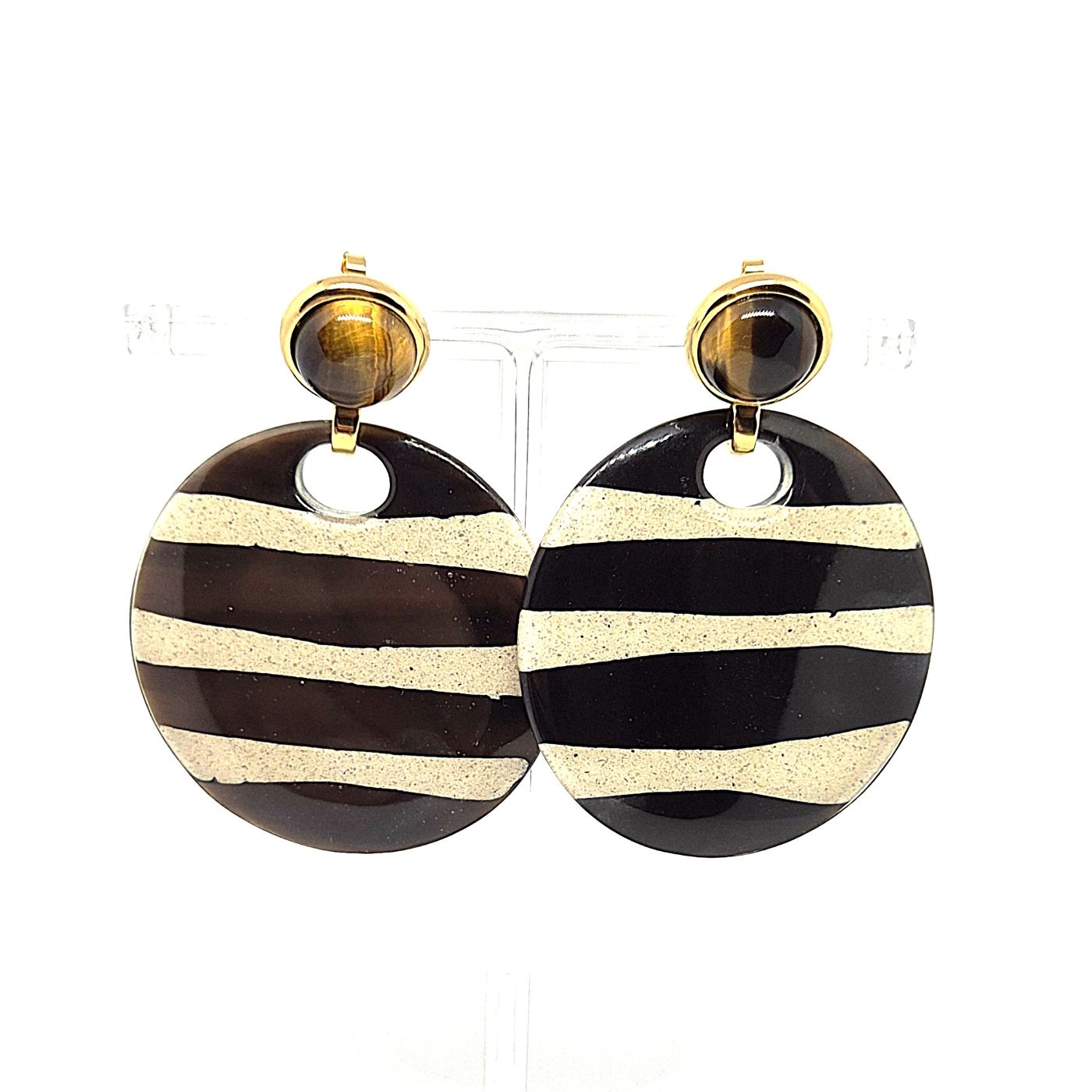 Boucles d’oreilles à tiges droites, un cabochon d’œil de tigre met en avant le pendentif zébré de corne et de sable résiné. Boucles aux beaux volumes, très légères à porter et d’une beauté brute et raffinée.