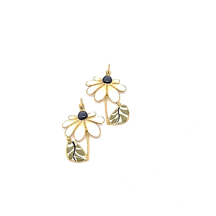 Dormeuses en bronze doré à l’or fin représentant une fleur, peinte à la main. Boucles lumineuses, aux couleurs douces et aux formes harmonieuses