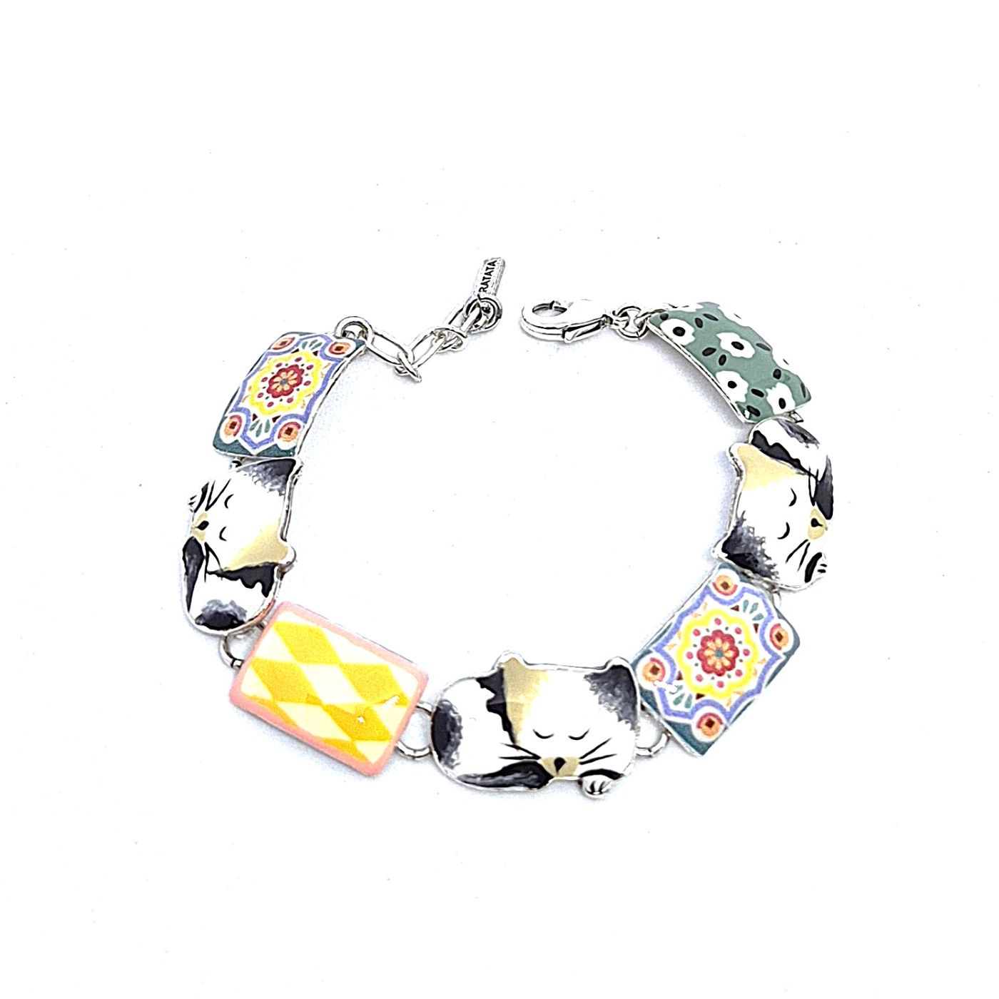 Bracelet en bronze argenté, les 7 éléments différents qui le composent sont peints à la main dans des teinte douces. Les éléments sont articulés, se qui permet au bracelet de bien s’adapter au poignet.
