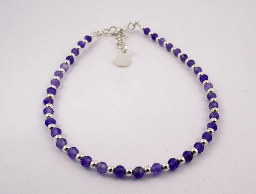 Bracelet en argent avec en alternance des perles d’améthyste facettées (4mm). Longueur standard de 18cm avec chaine de réglage