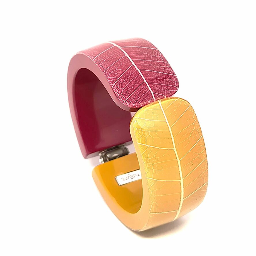 Bracelet rigide avec système d’ouverture et de 2 couleurs différentes. Chaque éléments est composés de feuilles prise sous une résine colorée. Très agréable a porter.