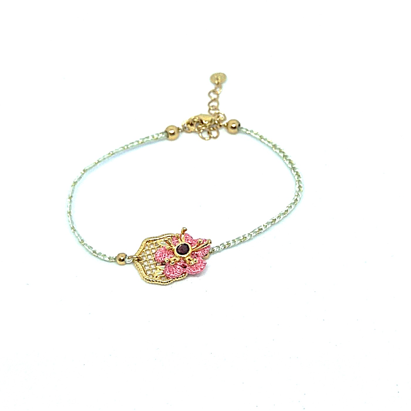 Bracelet fin en fil de coton et laiton doré. Une fleur en fil de coton est mise en valeur au centre du bracelet, elle est réhaussée par la présence de cristal. bracelet délicat et lumineux.