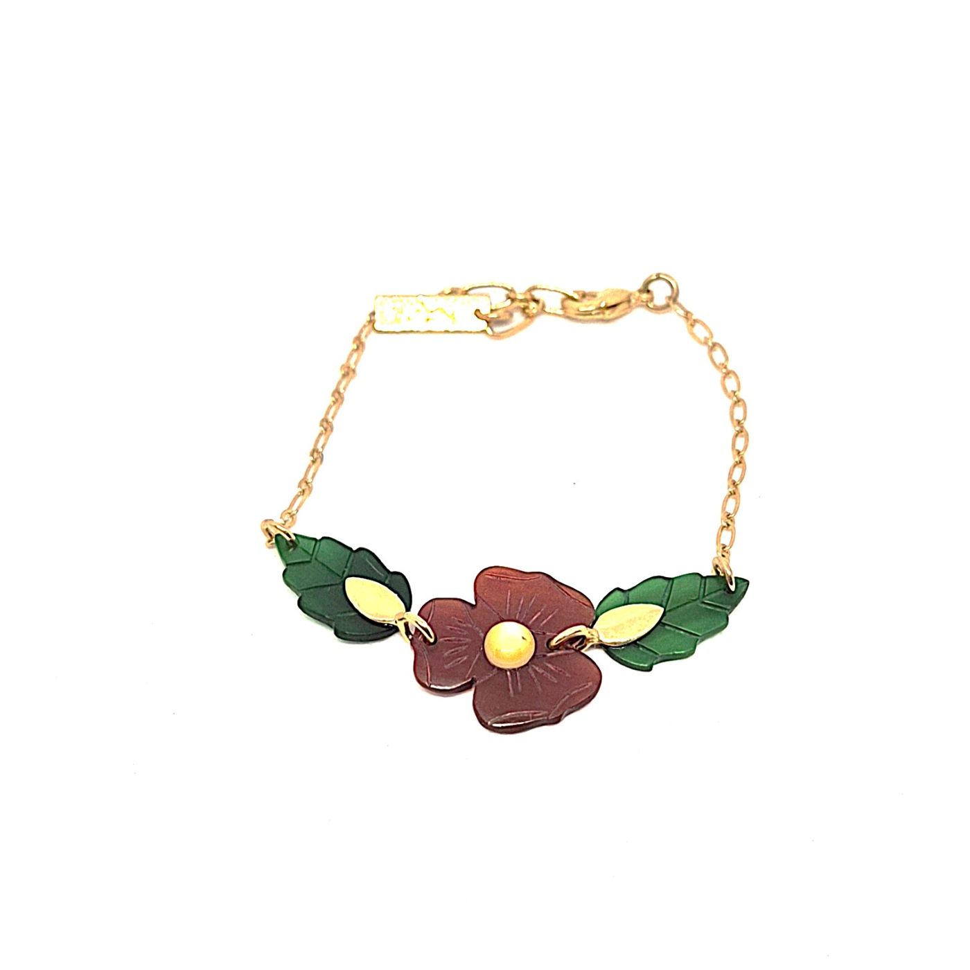 Bracelet avec une chaine ajourée en laiton doré. Les 3 éléments en corne teintée sont mis en valeur par la présence de nacre et les pointes de doré. Bracelet agréable à porter par la mobilité et la finesse de ces éléments.