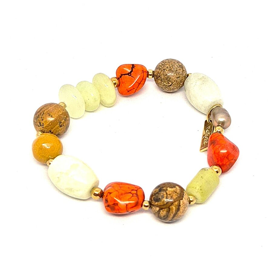 Bracelet élastique en bronze doré, avec un subtile mélange de matière et de couleurs. La couleur vive de la howlite est compensée par la douceur de la jade.