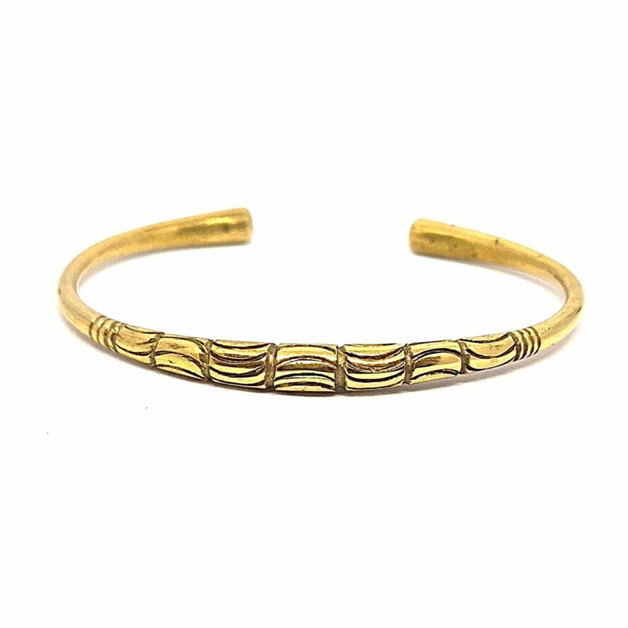 Bracelet rigide en laiton. De forme ovale pour bien s’adapter au poignet. Des motifs de vagues sont gravés sur le dessus du bracelet. Bracelets qui peut se porter seul, ou facile à assortir.
