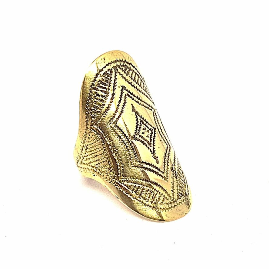 Bague non réglable en laiton. De forme ovale légèrement incurvée pour épouser le doigt, de délicats dessins sont gravés dessus.