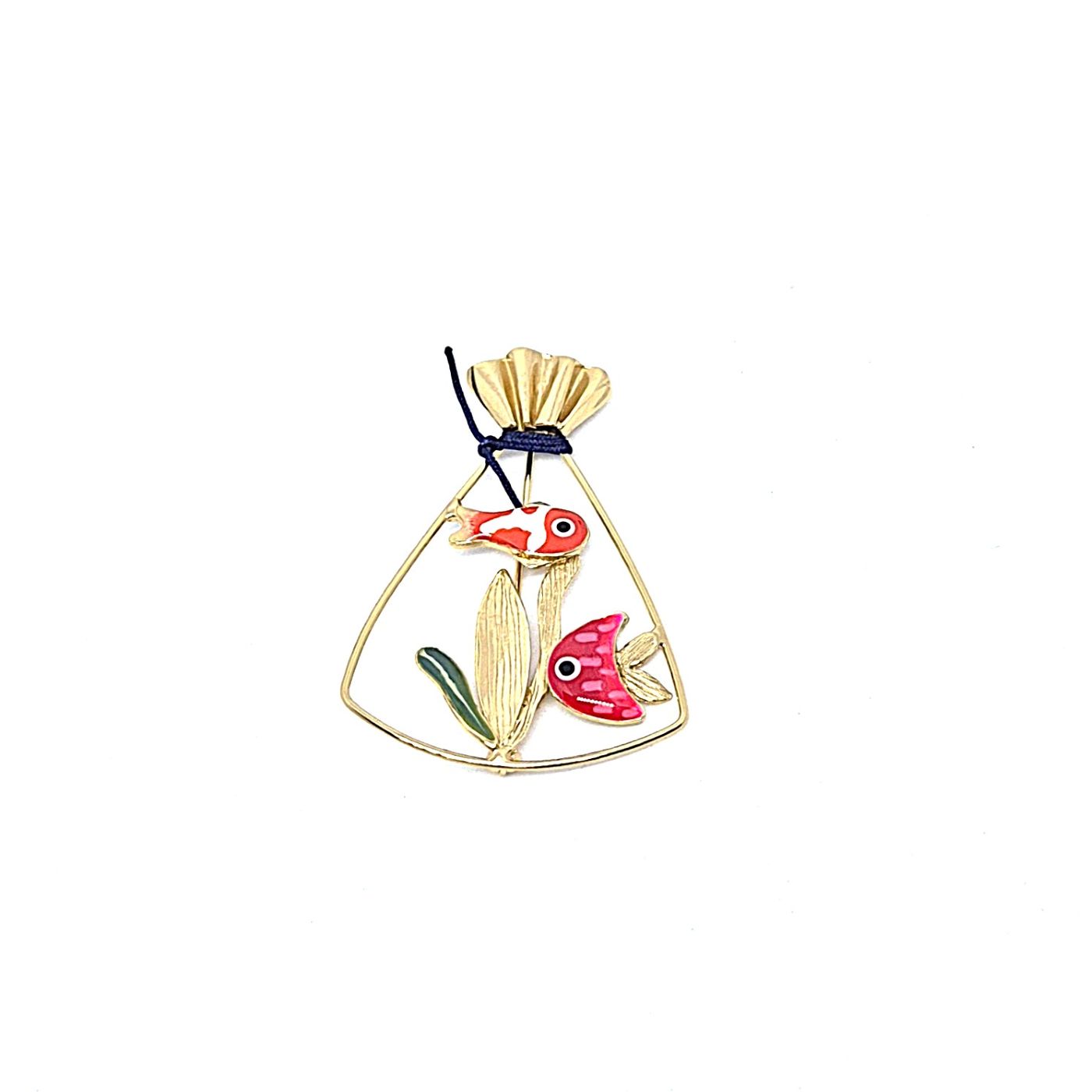 Broche en laiton doré. Grâce au travail de découpe des éléments, elle représente un sac avec des poisson a l’intérieur. Les détails sont peints à la main dans des couleurs vives. Broche légère et lumineuse qui va s’accorder avec tous vos vêtements.