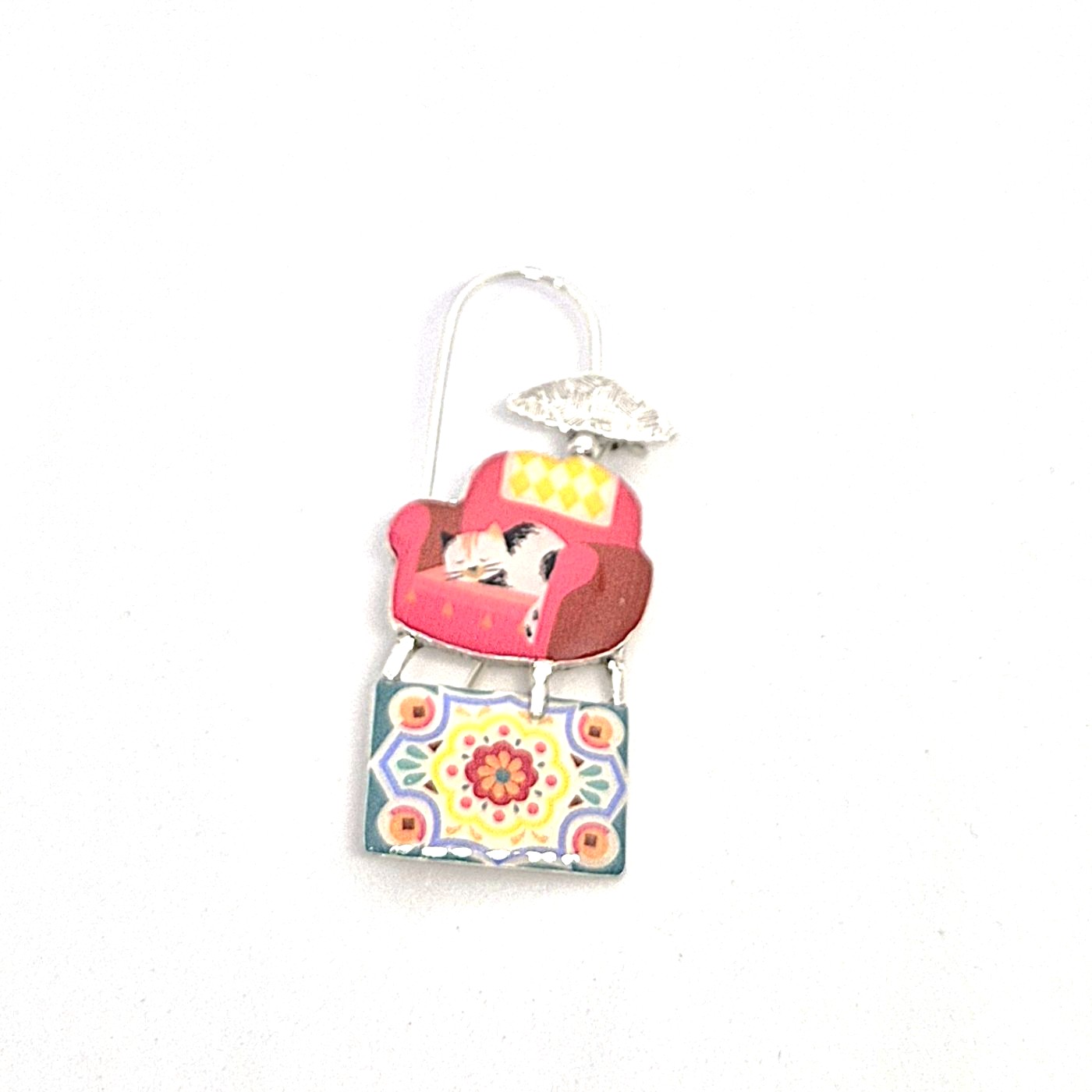 Broche en bronze argenté représentant un chat sur le sofa, tous les détails sont peints à la main. Broche légère qui s’adapte à  tous vos vêtements.
