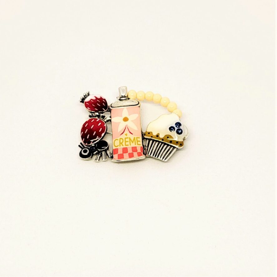 Broche en bronze argenté. Elle est composée de différents desserts, le tout souligné part une rangée de perles en cristal beige. Tous les éléments sont peints à la main dans des teintes gourmandes .