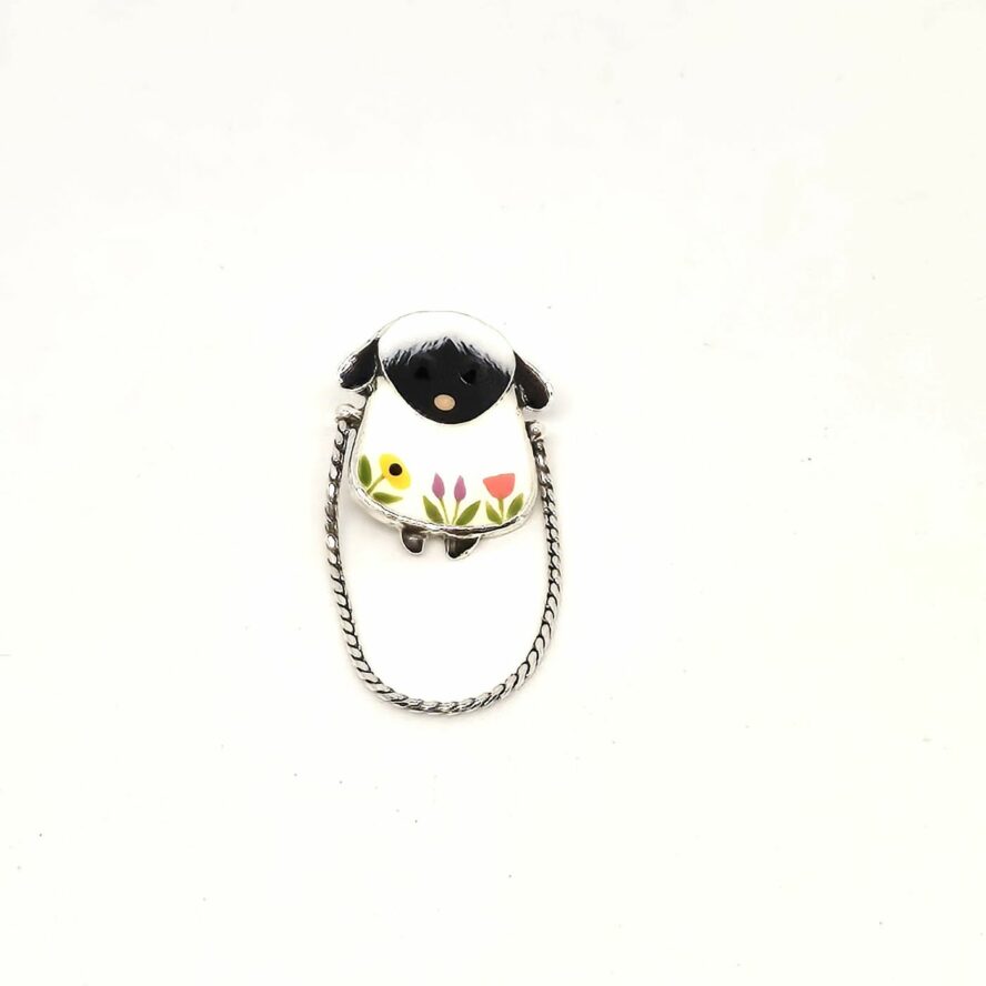 Broche en bronze argenté représentant un petit mouton . Chaque éléments sont peints à la main ,les couleurs sont douces et printanières. Broche discrète, avec une attache verticale
