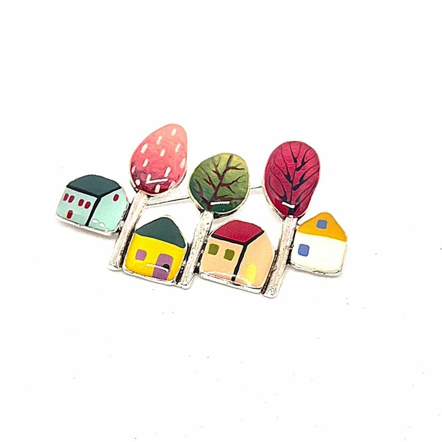 Broche en bronze argenté. Les éléments représentent plusieurs maisons de village, tous les éléments sont peints à la main.