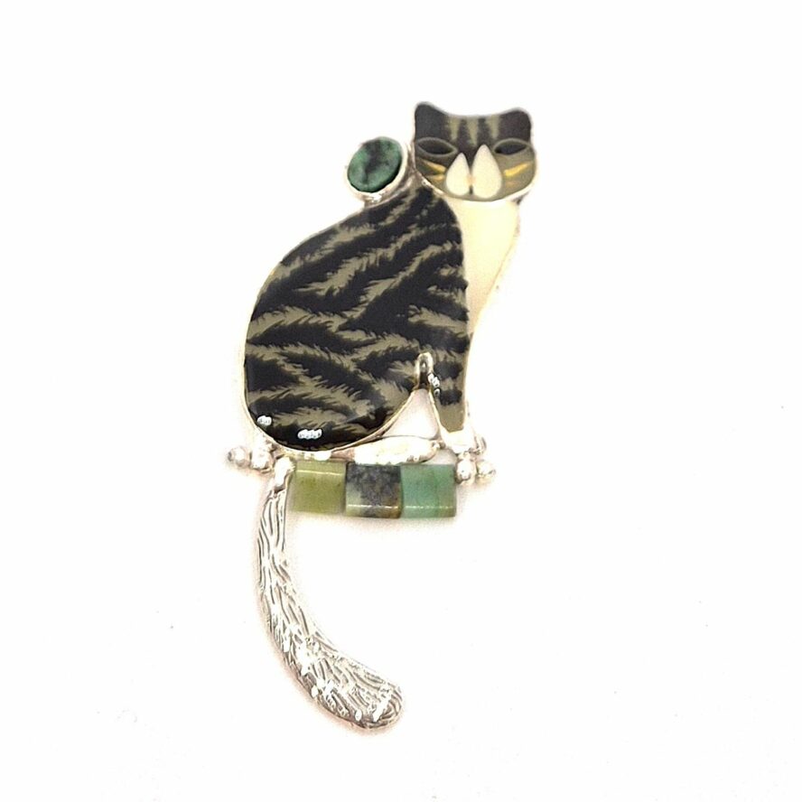 Broche en bronze argenté. Le chat est peint à la main, il est agrémenté de navettes de turquoises pour donner du mouvement