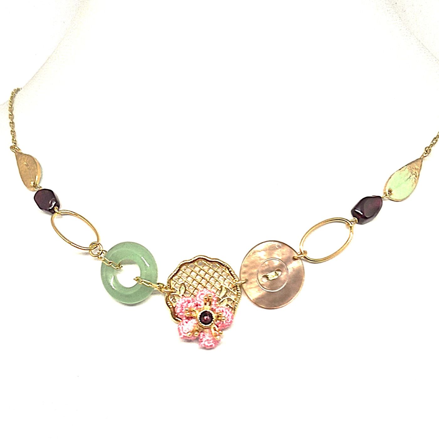 Collier fin en laiton doré, composé de 7 éléments. Une fleur en fil de coton est mise en valeur au centre du collier, elle est réhaussée par la présence d’aventurine et de grenat. Collier délicat et lumineux.