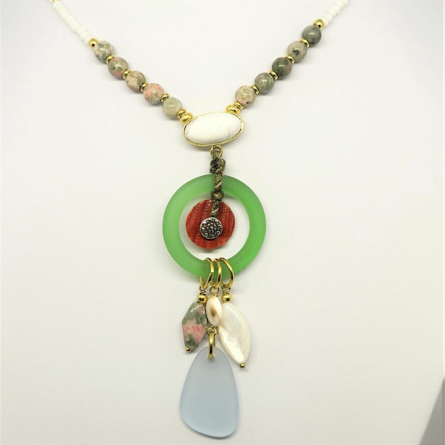 Collier avec un mélange insolite de perles de jaspe , howlite de verre poli et coquillage . Cet ensemble élégant et brut par les matériaux est très doux par ces couleurs .