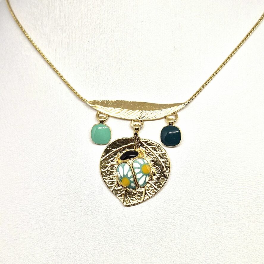 Collier en bronze doré a l’or fin avec une chaine ronde tressée, de la partie rigide en forme de feuille part 3 pampilles dont la centrale est riche en détails. Tous les élément colorés sont peints à la main.